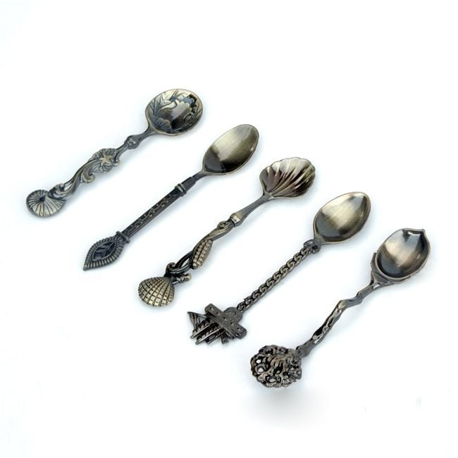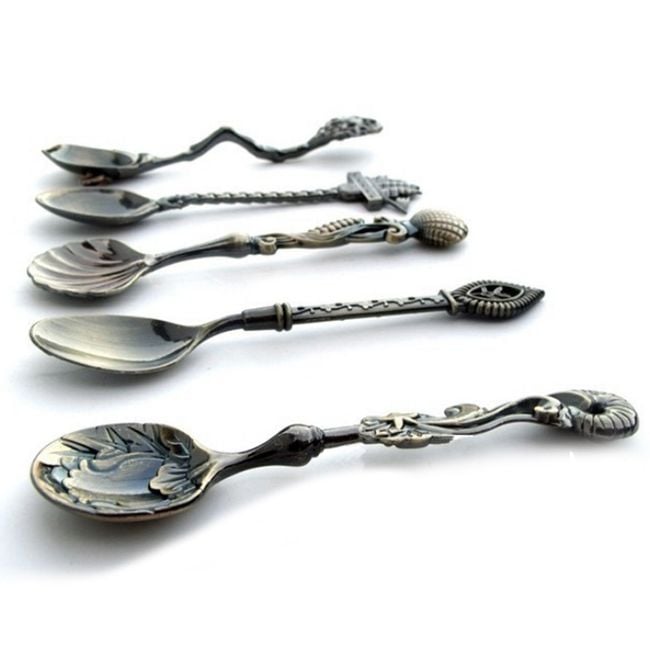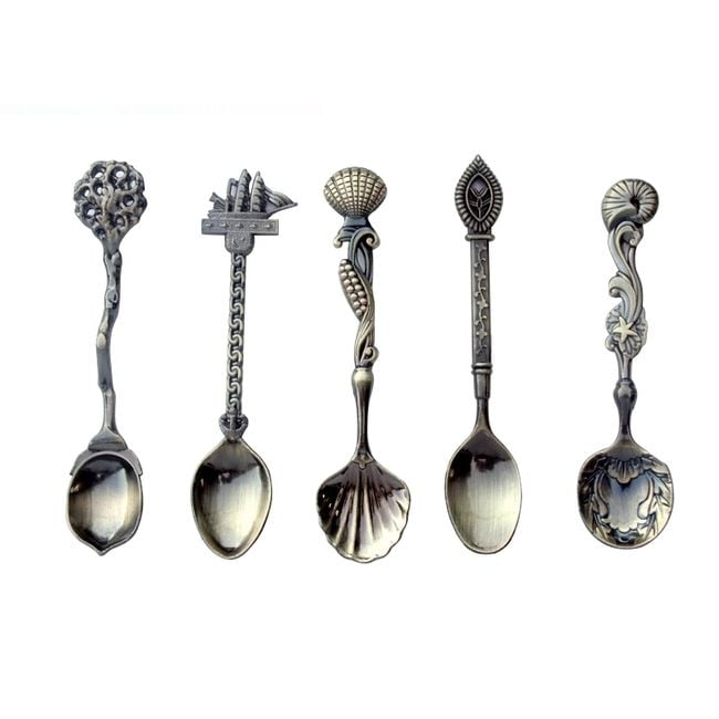 Conjunto de colheres de chá ou café com um design interessante e antigo. Se deseja desfrutar plenamente da sua chávena matinal da sua bebida favorita, estas colheres não podem faltar na sua cozinha. Cada peça do conjunto tem uma forma original com diferentes motivos. A embalagem contém cinco peças.