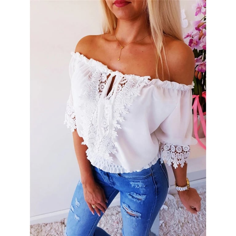 Top feminino com ombros à mostra e renda