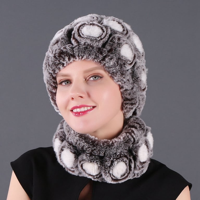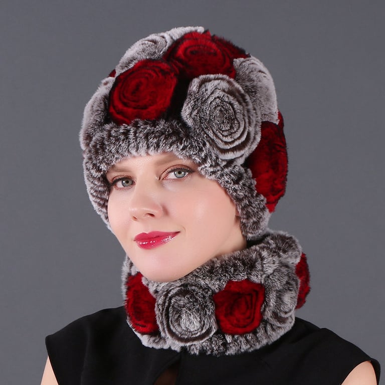 Luxuoso chapéu de pele feminino com cachecol na mesma tonalidade.