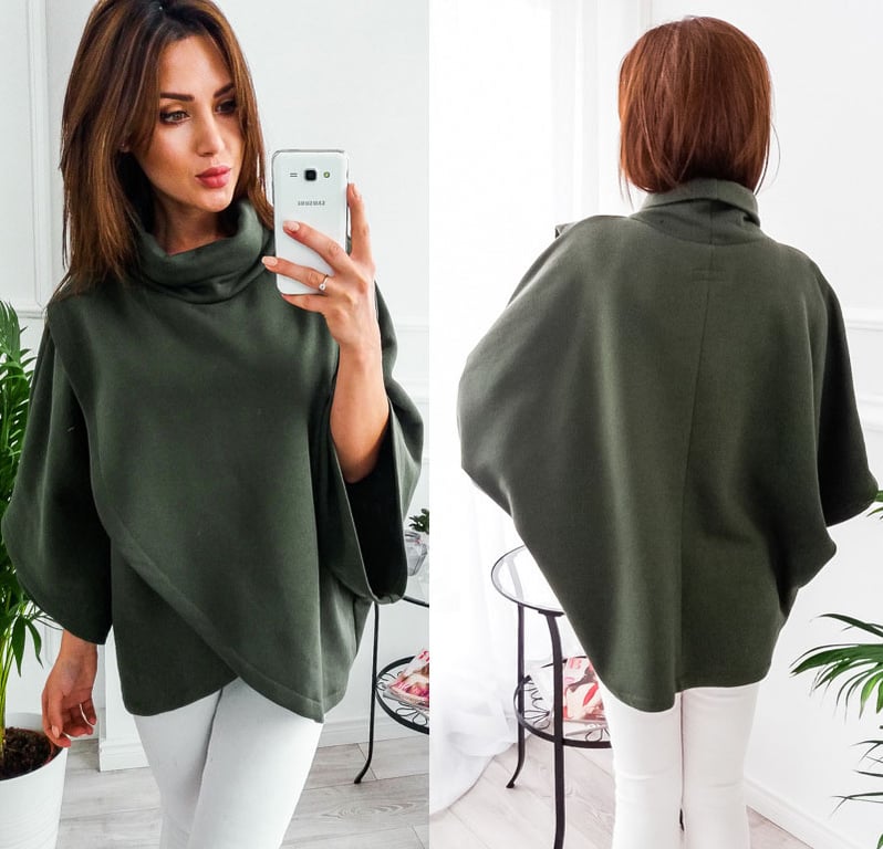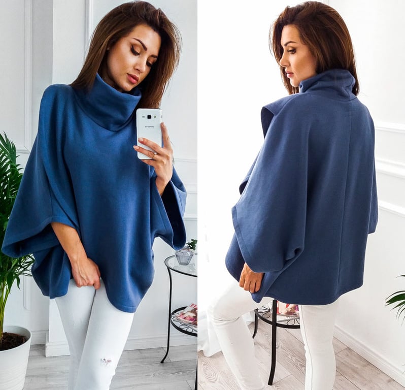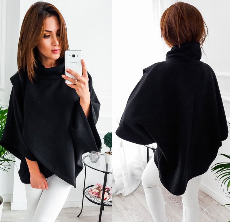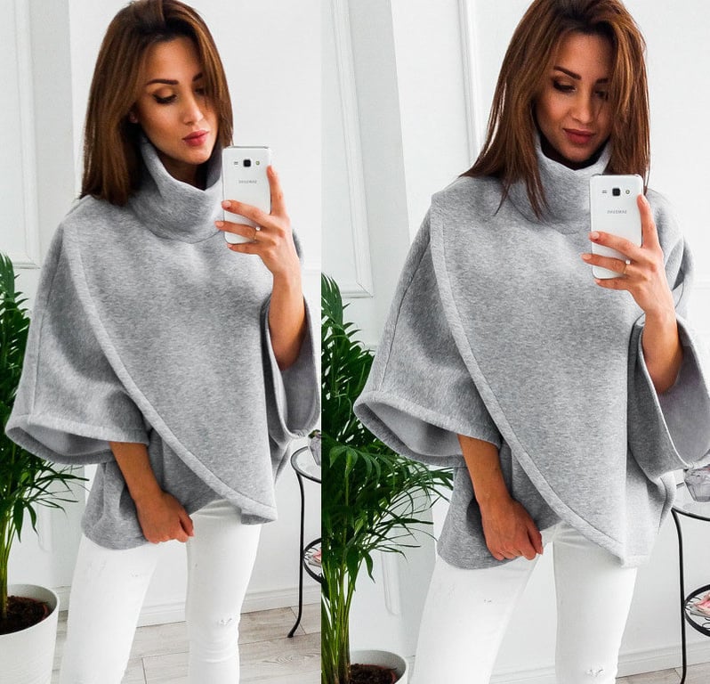 Lindo poncho feminino feito de material de moletom. Tem um gola alta e na frente apresenta um efeito de sobreposição. Um ótimo acessório para a próxima primavera.