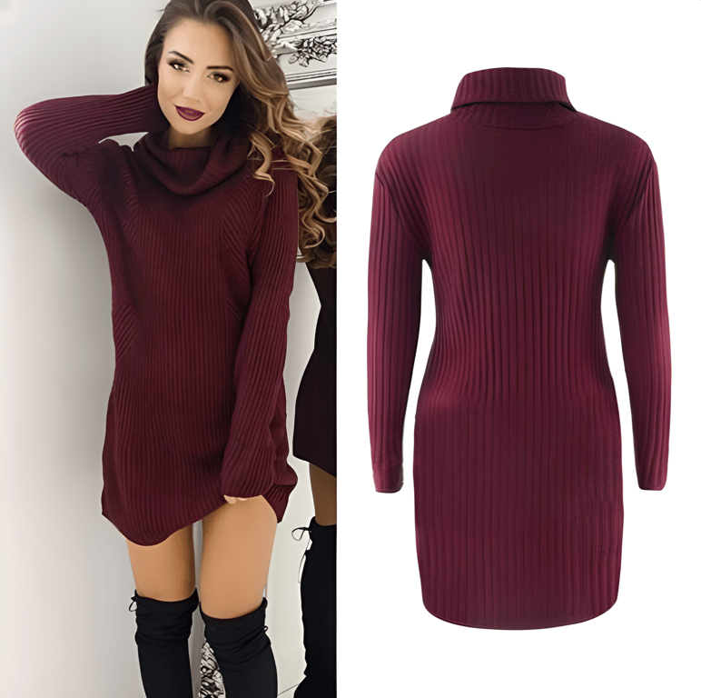 Estiloso suéter longo, com uma grande gola alta e tricotado. Pode ser usado como vestido.
