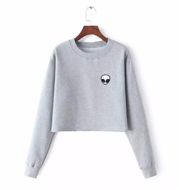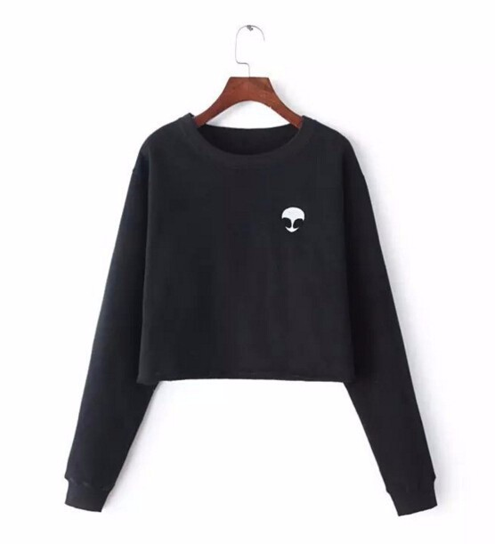 Sweatshirt curta de primavera com uma pequena imagem de um extraterrestre. Pode escolhê-la na cor cinza ou preta.
