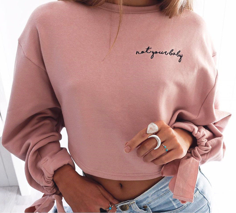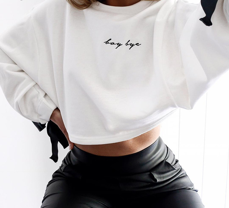 A sweatshirt curta é ideal para o período quente da primavera. Tem mangas longas e largas e é decorada com uma delicada inscrição.