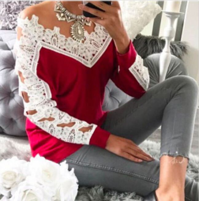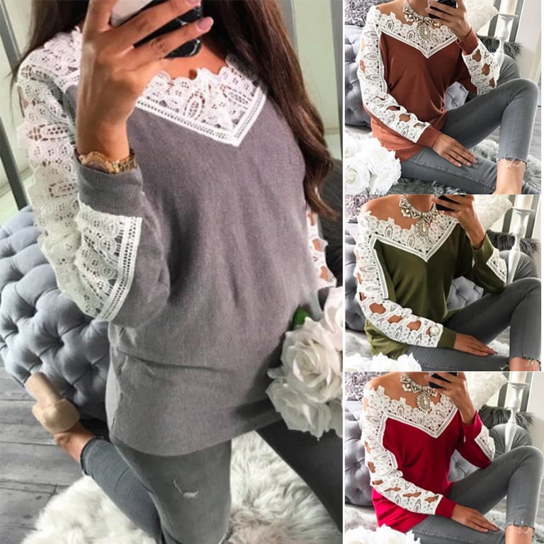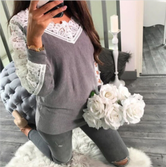 Sweatshirt feminina de primavera decorada com uma linda renda. Tem decote em V. Está disponível em quatro cores lindas.