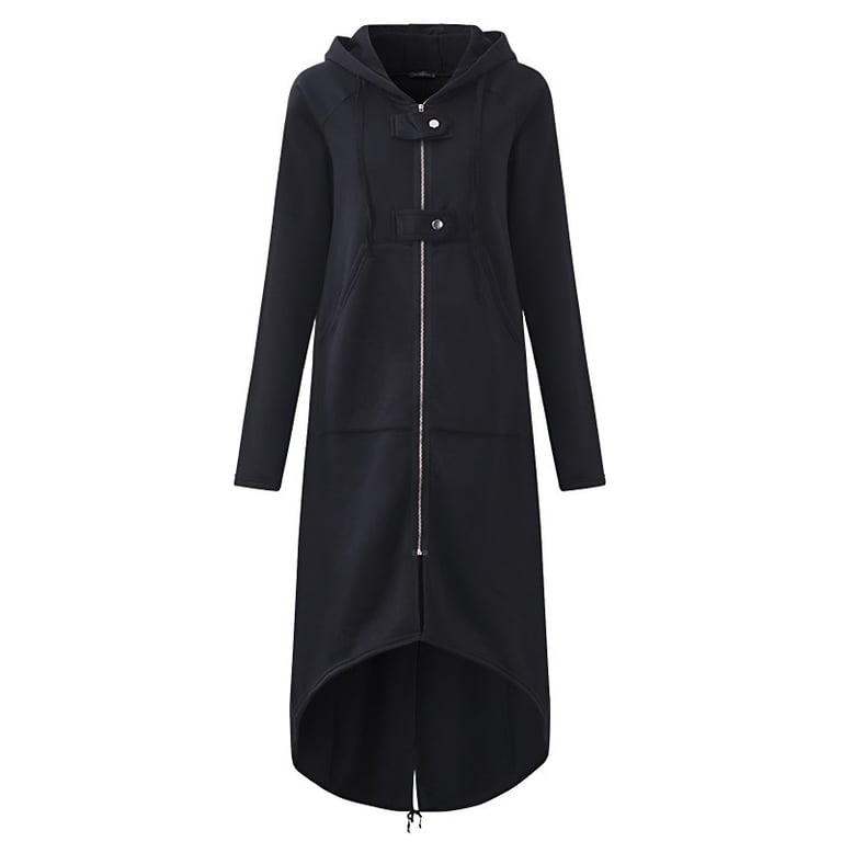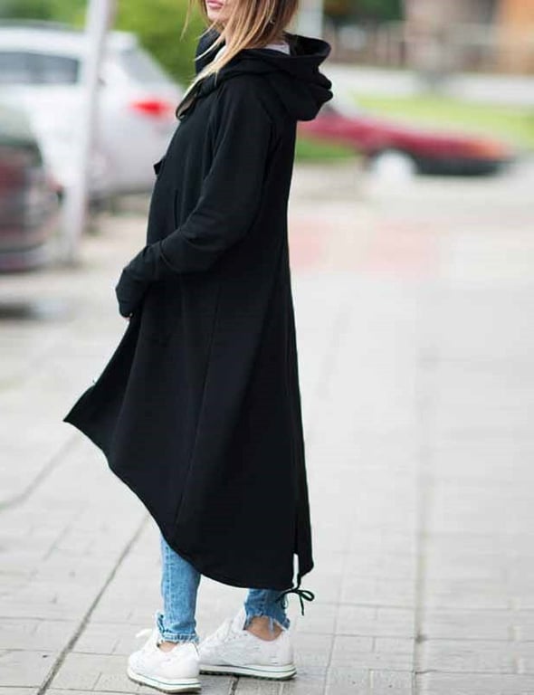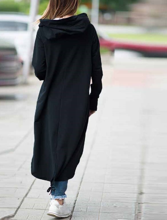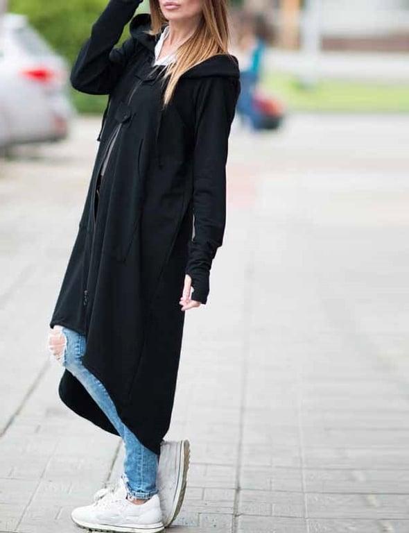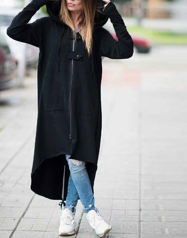 Moletom feminino estiloso preto com capuz. A parte de trás é mais longa. Fecha com zíper. Ideal para o tempo livre.