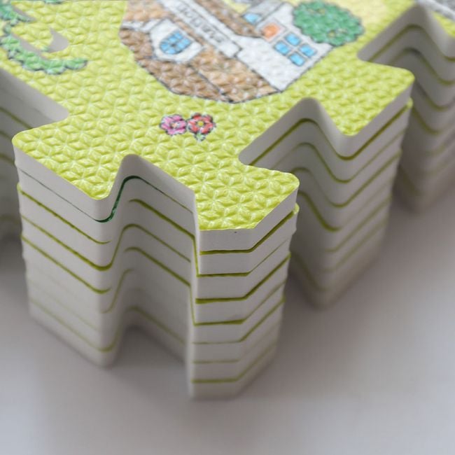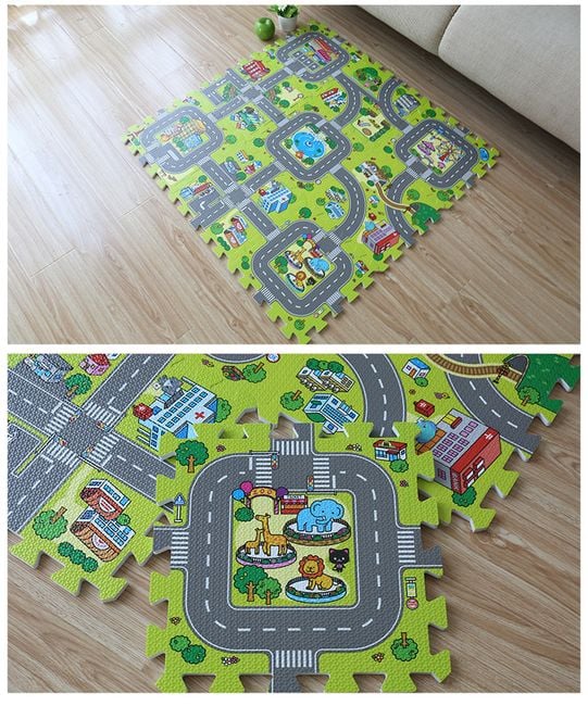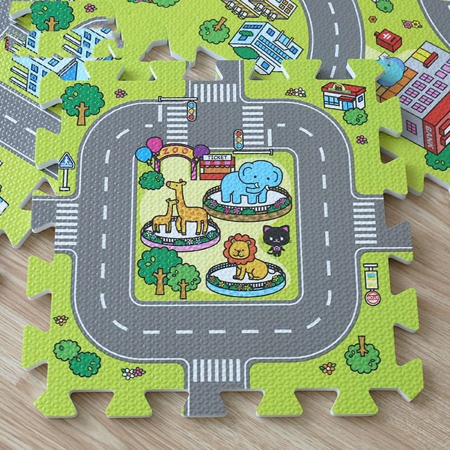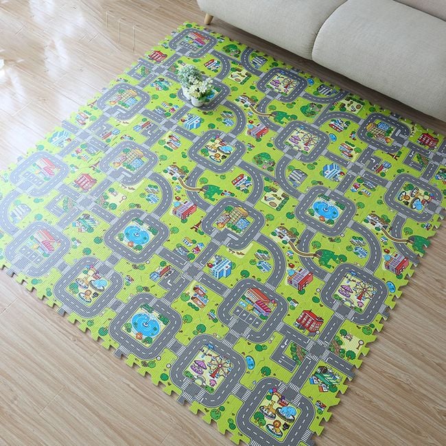 Tapete de jogo confortável com tema de estradas. Ideal para brincar com carrinhos. Composto por 9 peças de puzzle em espuma.