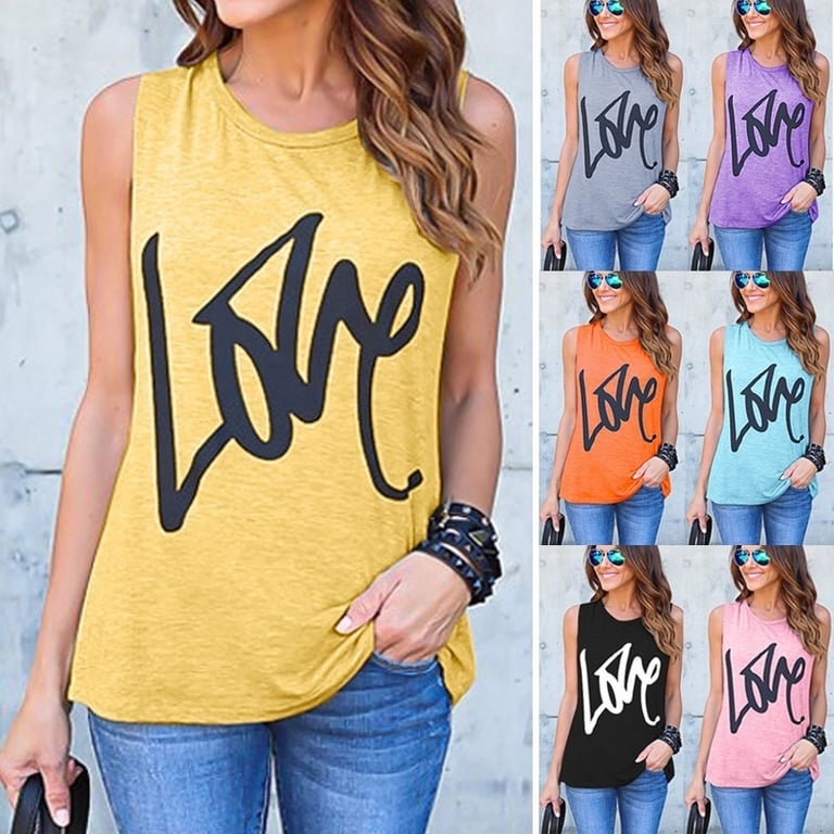 Top feminino confortável sem mangas com a inscrição LOVE. Está disponível em várias cores bonitas.