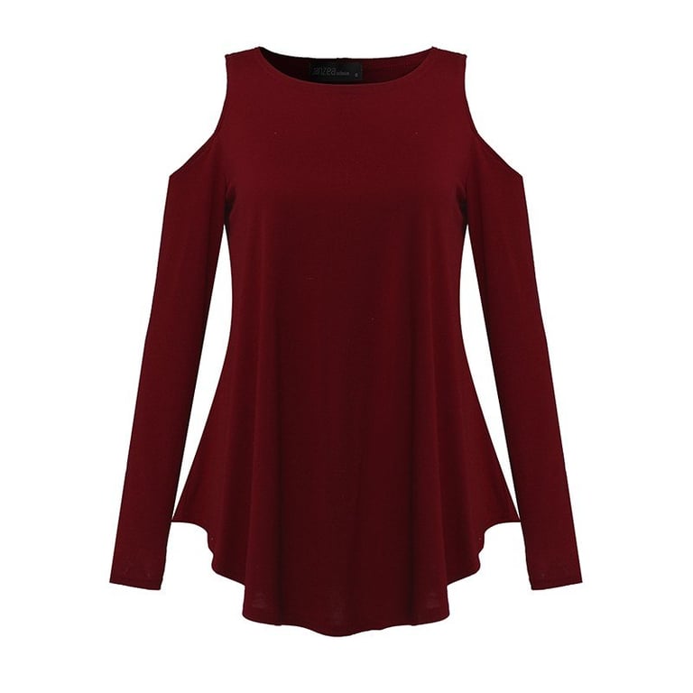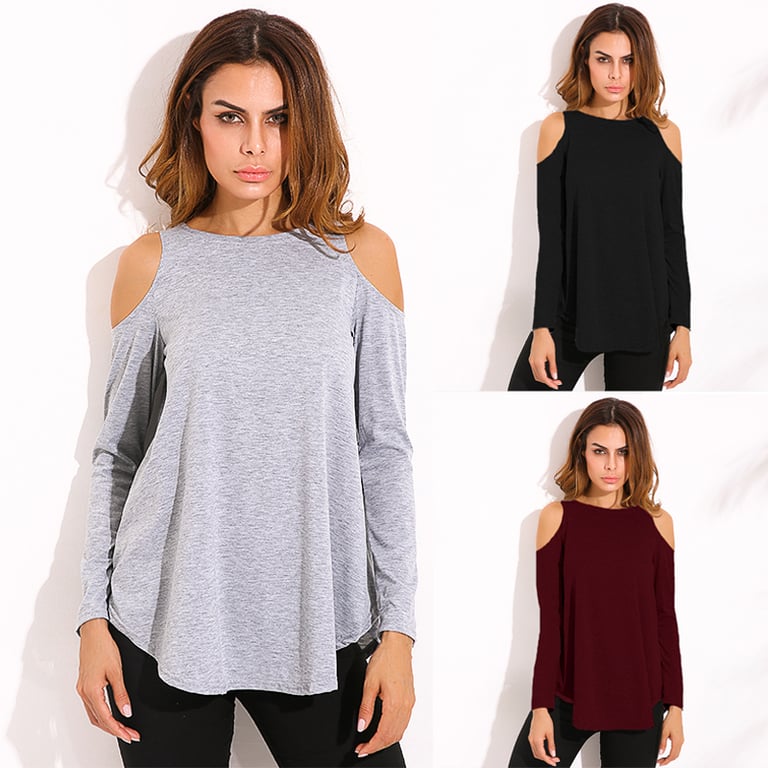Top feminino com mangas longas. Ombros à mostra na moda. Decote redondo. Corte solto.